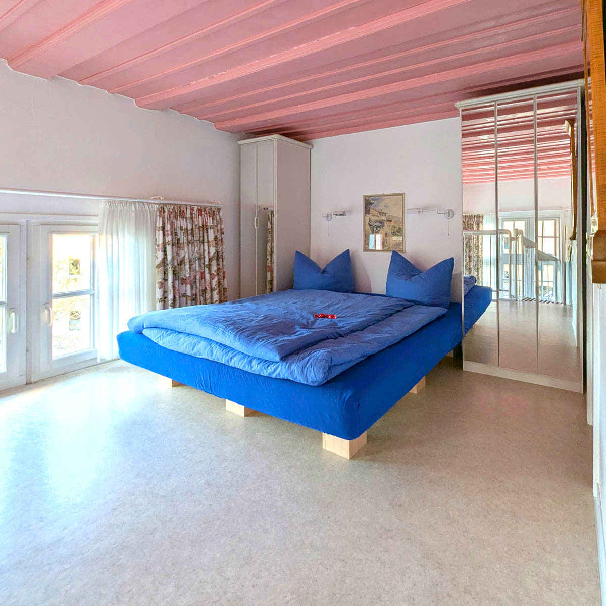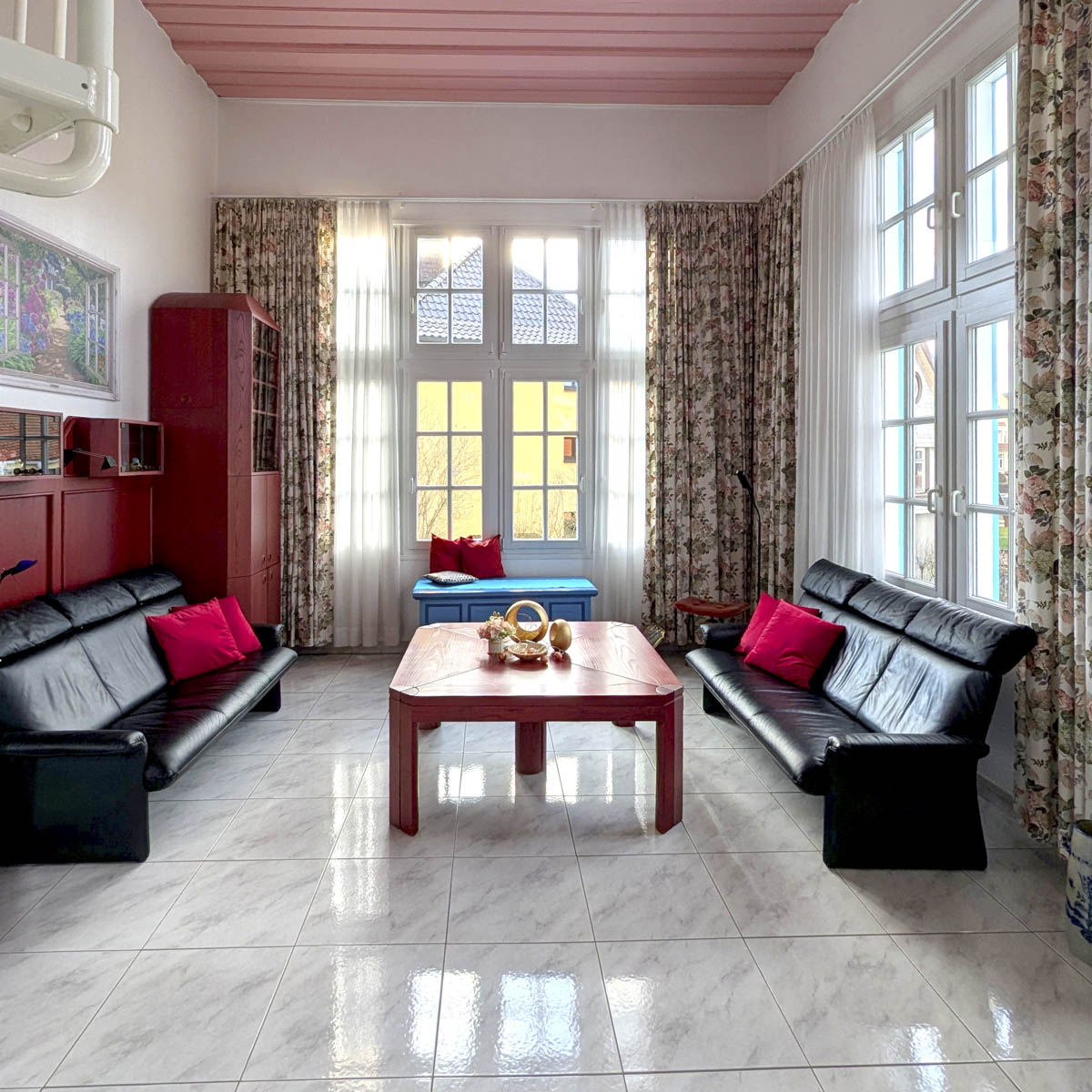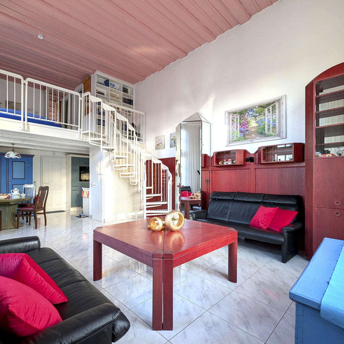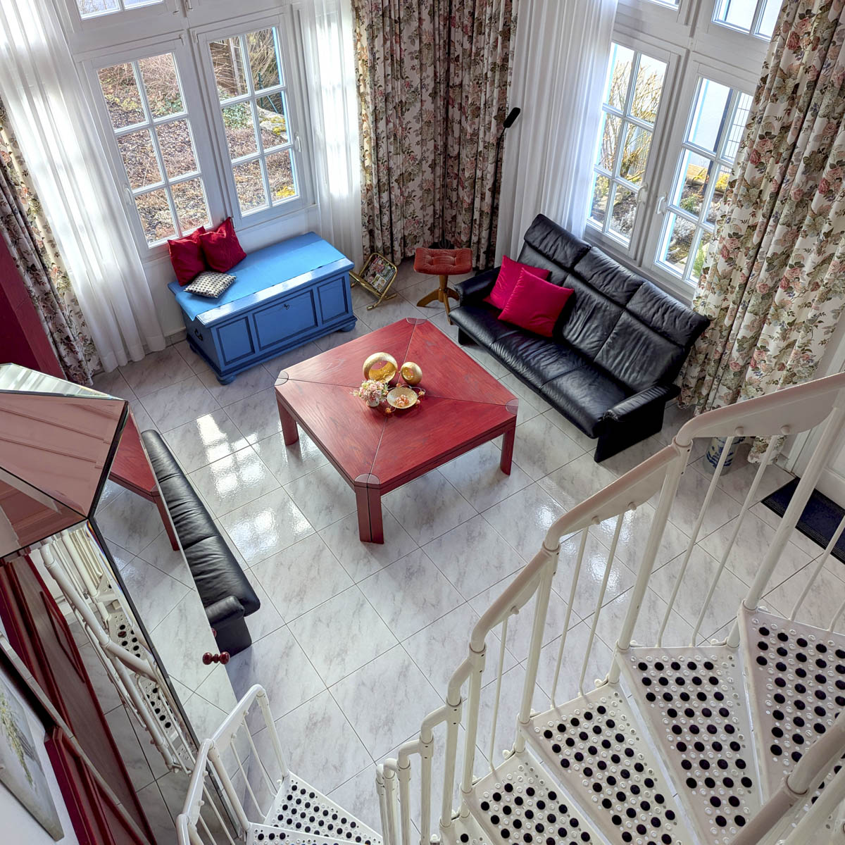 Die Deckenhöhe des Wohnzimmerbereichs beträgt ca. 4,8 m.